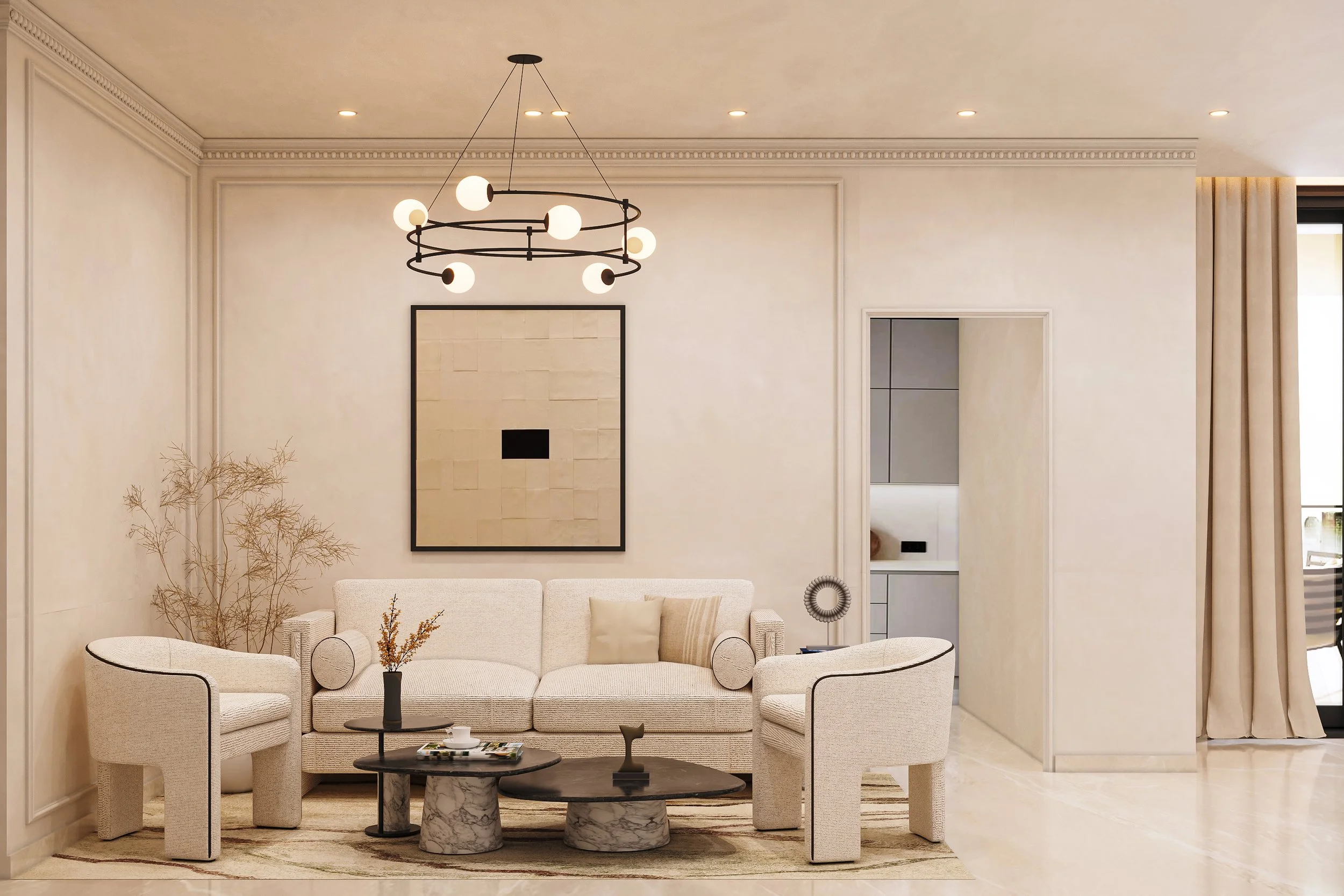 The spatial narrative is guided by the principles of serene minimalism, articulated through linear geometries, restrained detailing, and a refined material vocabulary. A neutral base of beige-toned finishes establishes a seamless sense of continuity and expansiveness across the apartment. To enrich this canvas, the interiors are layered with accent luminaires, classical wall moldings, muted pastel inflections, and curated eclectic décor artifacts, collectively imparting depth, texture, and nuanced visual drama.