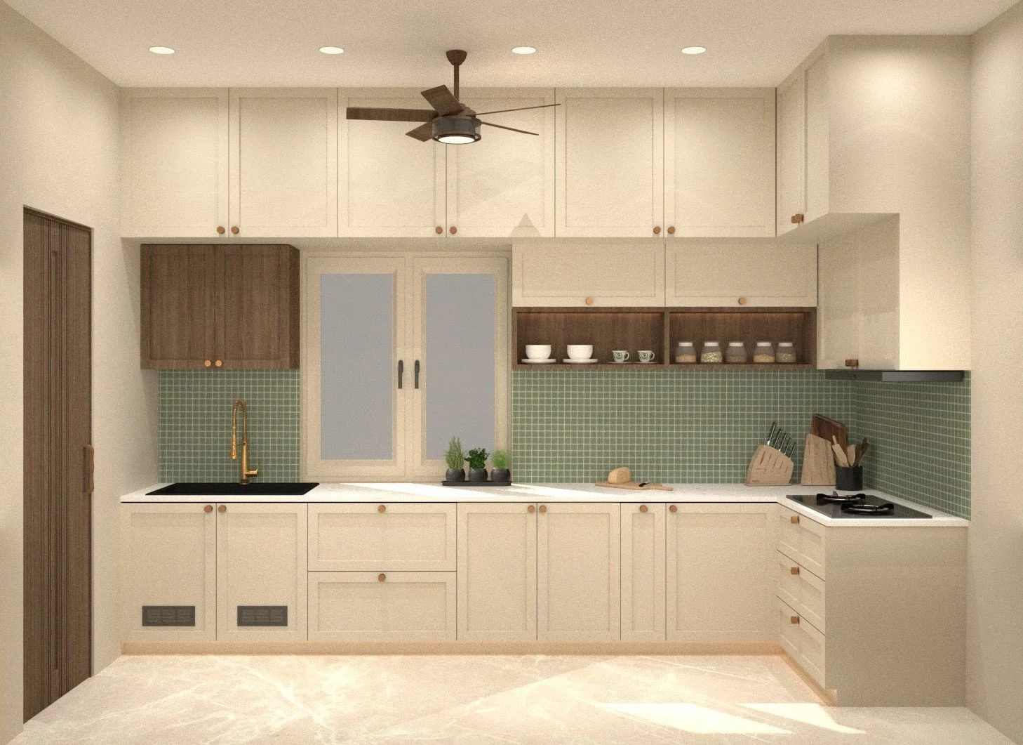The otherwise monochromatic palette is punctuated by strategic chromatic interventions: a modular kitchen defined by a bold green finish, a bedroom animated with refreshing green accents in wardrobes, soft furnishings, and layered textiles, and another bedroom distinguished by the presence of a burgundy cot. These carefully orchestrated insertions of color introduce vibrancy and focal interest while maintaining a coherent, harmonious aesthetic dialogue throughout the residence.