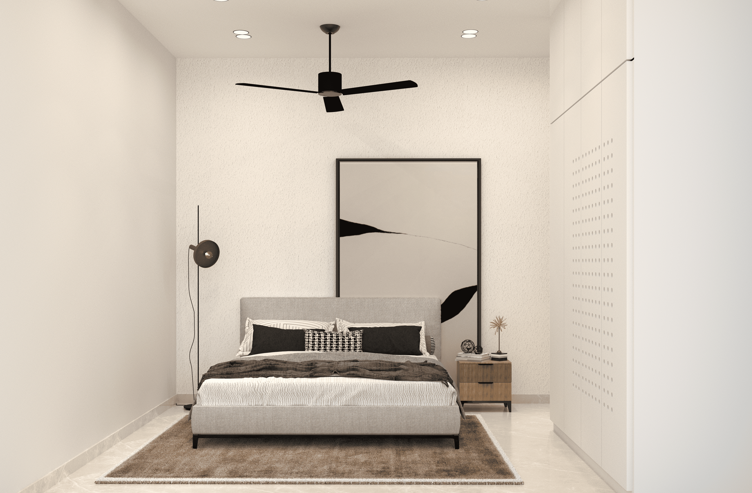 The residence embodies a modern contemporary aesthetic with a minimalist approach, defined by clean geometries and uncluttered spatial planning. A neutral palette of light gray, beige, and warm brown tones establishes a serene and cohesive backdrop, enlivened by strategically placed blue accents that create visual interest. Textured wall panels in soft greige add subtle depth, while curated elements—such as velvet cushions, ceramic vases, and abstract artwork—serve as focal points within the interiors.